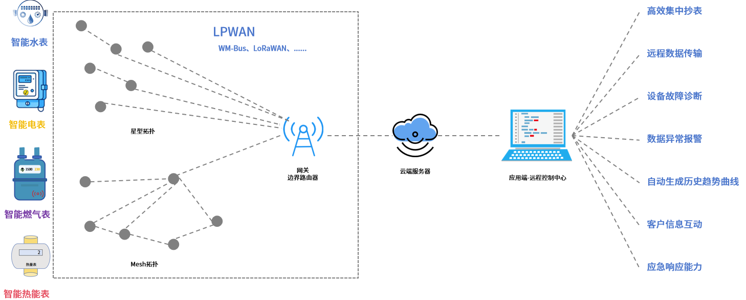 如下图所示,智能四表无线集抄方案通过应用LPWAN(低功耗广域网络)技术,实现了水表、电表、燃气表、热能表的智能化、远程化、自动化管理,并覆盖了数据采集、传输、处理、应用全流程,具有网络结构自适应、运行稳定、方便扩展等特点,可有效提升能源供应公司的计量管理效率与客户服务能力。