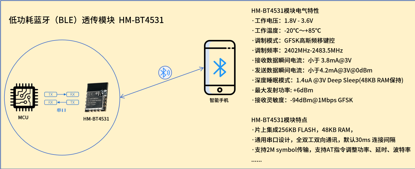 HM-BT4531是一款通过BQB、FCC、CE、IC、SRRC认证的低功耗、高性能BLE模块,其内部集成32位ARM Cortex-M0内核@64MHz、48KB SRAM、256KB FLASH与先进的5.2 BLE射频收发器,并采用智能干扰消除技术,支持无线数据透传功能,可实现手机或手持设备对智能四表计量数据的实时读取与配置,使现场抄表与维护更为便捷高效。