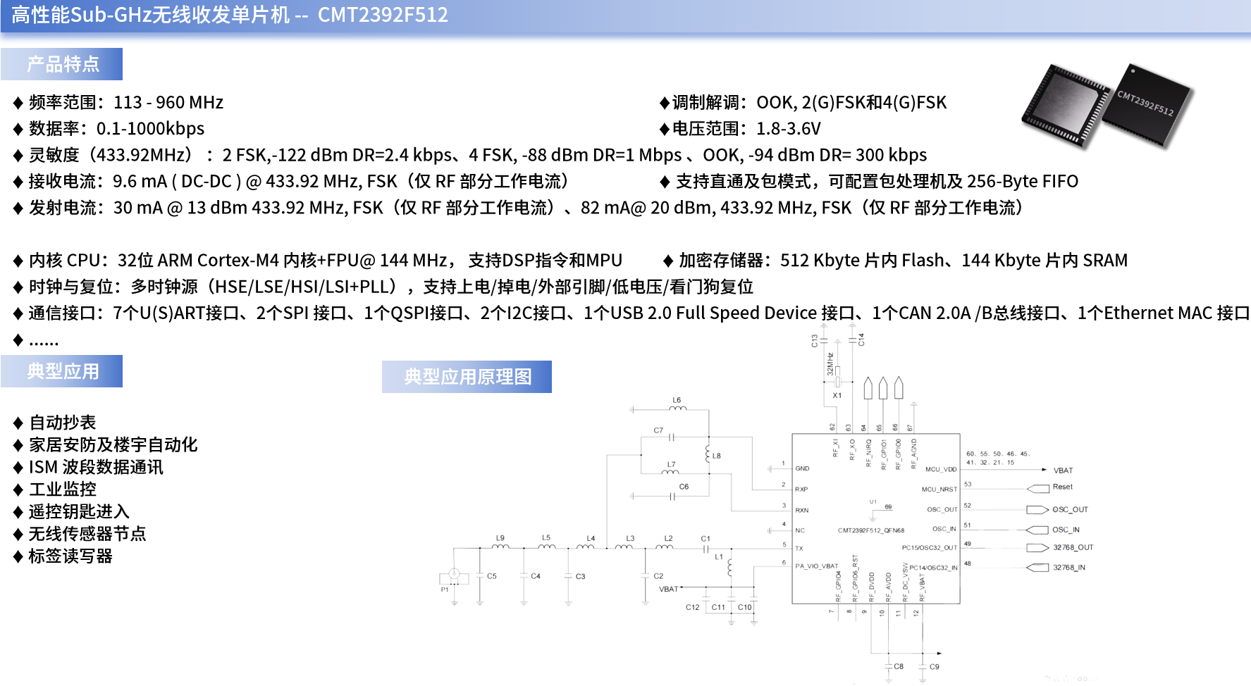 CMT2392F512是一款高性能的Sub-GHz无线收发单片机,其内部集成32位ARM Cortex-M4F内核和一颗超低功耗Sub-GHz射频收发器,支持多种数据包格式及编解码方式,可进一步简化外围元件数量、缩小硬件体积、降低运行功耗、优化产品成本与提升产品可靠性,并有效提升智能四表无线集抄质量。