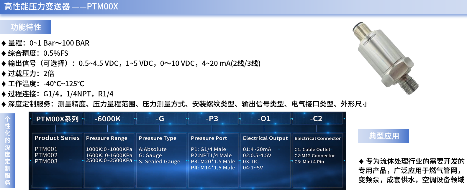 PTM00X是一系列为流体处理行业开发的专用产品,具备专业防水锤冲击能力、良好的电气性能及长期稳定性,可精准监测城市燃气管网或燃气容器内部的压力波动,并根据实时数据反馈进行灵活调节。