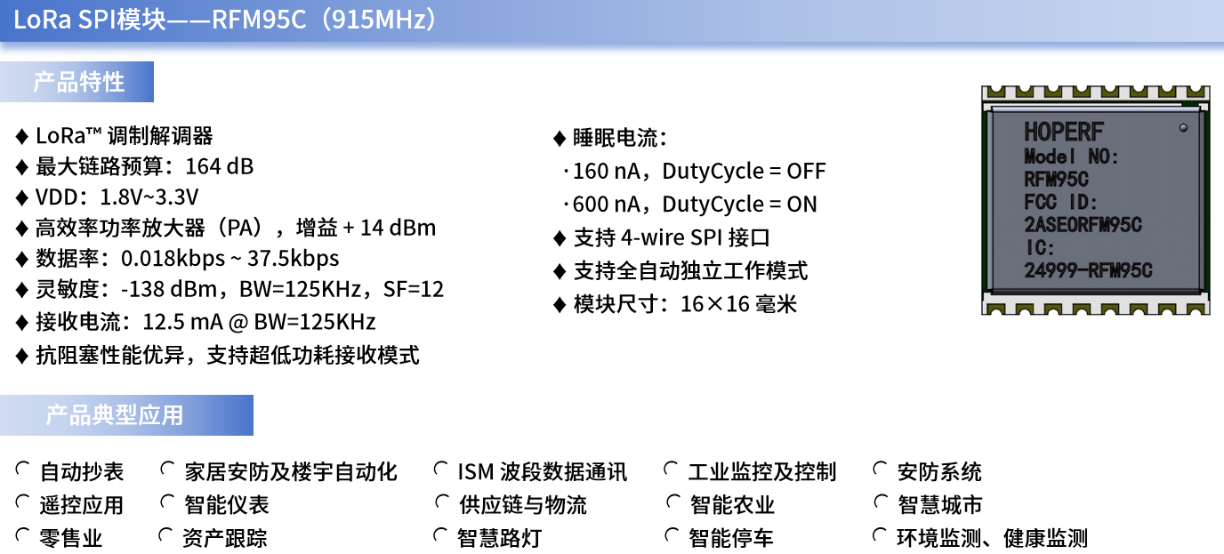 RFM95C是一款电流功耗显著低于行业内其他装置,采用先进数模混合设计,基于独创自适应速率算法的LoRa SPI模块,其不仅能覆盖从远距离、低速率到中短距离、中高速率的通信场景,实现对“距离、抗干扰、功耗”三角权衡问题的突破,还能在复杂环境确保智能四表无线集抄数据的稳定传输。