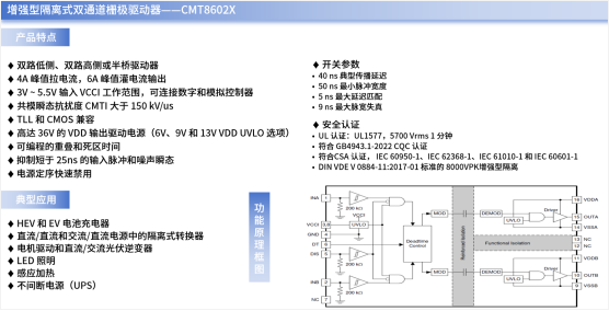 CMT8602X是一系列增强型的隔离式双通道栅极驱动器,其4A的峰值拉电流和6A的峰值灌电流不仅可驱动高达5MHz的功率晶体管,还具有一流的传播延迟和脉宽失真度。CMT8602X的输入侧通过一个5700V rms增强型隔离层与两个输出驱动器隔离,共模瞬态抗扰度(CMTI)的最小值为150 kV/μs。两个二次侧驱动器之间采用内部功能隔离,可在高达1500 VDC的直流电压下工作。