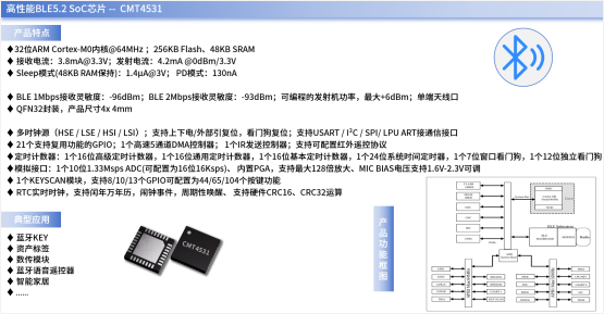 在无线性能与系统集成度方面,CMT4531集成了符合BLE 5.2规范的射频收发器,最大发射功率可达+6 dBm,能在复杂环境中实现稳定的信号传输。同时,CMT4531内置 32 位MCU、256 KB Flash、48 KB SRAM以及丰富的外设接口,支持多连接与数据扩展,可在单芯片上完成资产标签的逻辑控制,有效降低BOM成本并缩短BLE资产标签的整体开发周期。