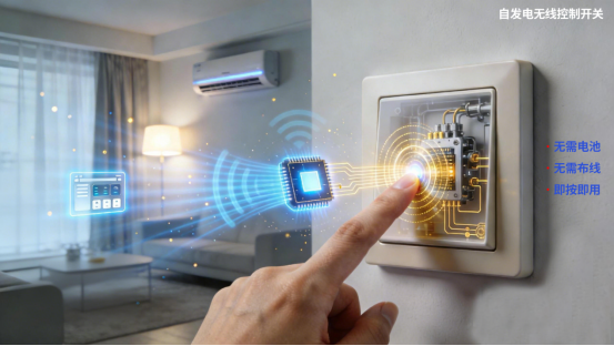 “自发电”无线控制方案是指将管理者按压/拨动开关时所产生的机械能(微量动能),通过能量转换方案(电磁感应/压电效应)转化为有效电能,从而唤醒开关装置内集成的微能量收集发射芯片进入工作模式,并直接触发芯片内置的硬件逻辑完成无线控制信号的发射,可为管理者实现“无需电池、无需布线与即按即发”的无线遥控体验。