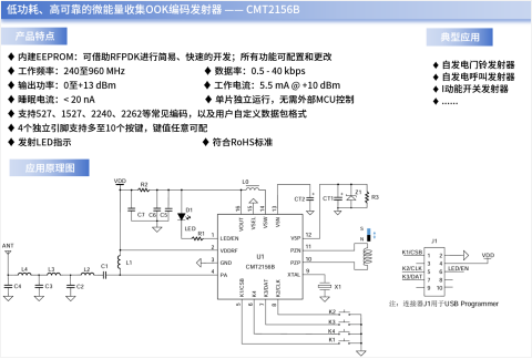 此外,CMT2156B还支持用户自定义编码器,可让用户根据具体需求进行优化设计,尤其适用于动能供电,无电池的无线发射应用场合。