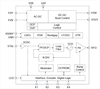在系统架构上,Sub-GHz微能量收集发射芯片往往通过高度集成的架构设计,将射频发射、数据编码与控制逻辑整合于单一芯片之中,无需外部MCU即可在极为有限的能量预算下完成一次完整且可靠的无线信号发射过程。