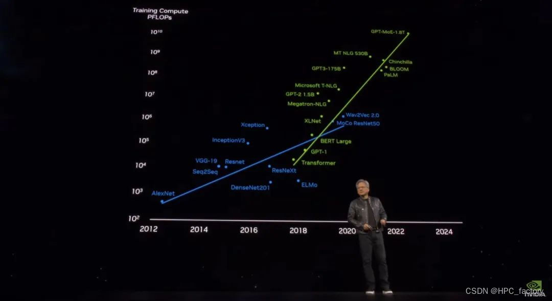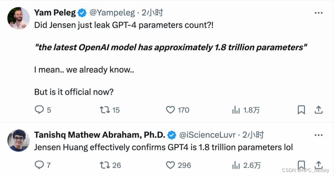 黄仁勋提到,大模型参数量正在呈指数级增长,此前 OpenAI 最大的模型已经有 1.8T 参数,需要吞吐数十亿 token。即使是一块 PetaFLOP 级的 GPU,训练这样大的模型也需要 1000 年才能完成。这句话还透露了一个关键信息:GPT-4 的实际参数量应该就是 1.8 万亿。