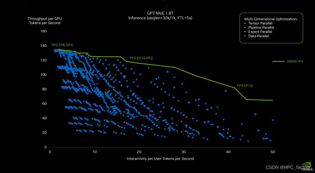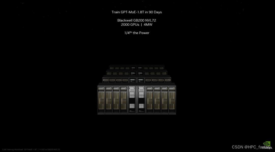 再详细对比一下性能的升级,以前使用 Hopper 训练 GPT-MoE-1.8T,8000 块 GPU 要花费 90 天,同样的事只需要 2000 块 GB2000,能耗也只需要四分之一。