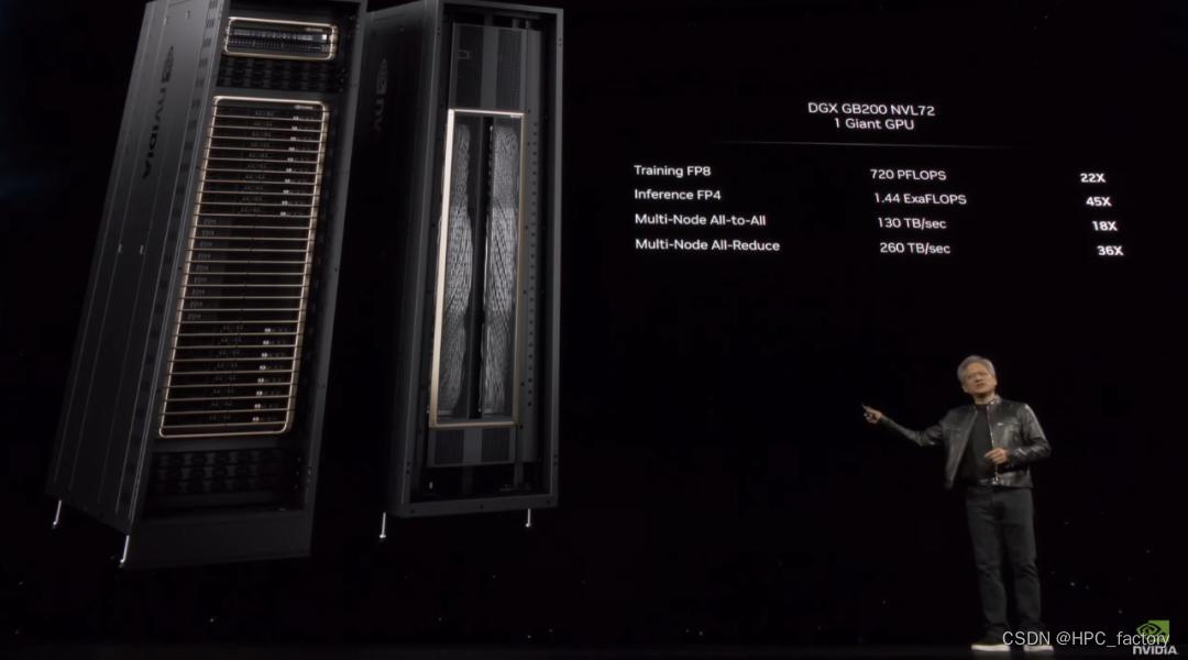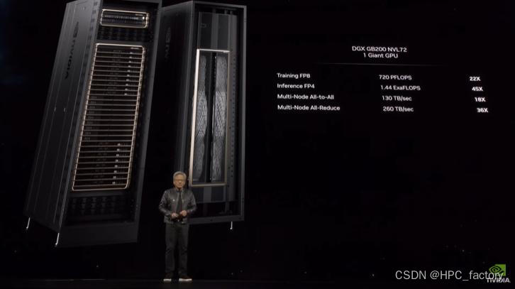 通过高速互联的机制,DGX GB200 NVL72 可以被认为是一个超级 GPU,FP8 训练吞吐量高达 720 PFLOPS、FP4 推理吞吐量为 1.44 ExaFLOPS,多节点 All-to-All 通信速度为 130TB / 秒,多节点 All-Reduce 通信速度为 260TB / 秒。