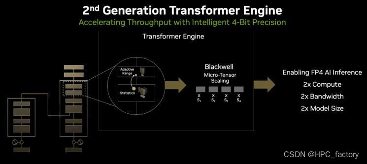 30 倍 AI 算力是如何做到的?除了使用新制程,并联两块芯片以外,Blackwell 的关键改进在于引入第二代 Transformer 引擎,它支持了 FP4 和 FP6,使得计算、带宽和模型大小翻了一番。