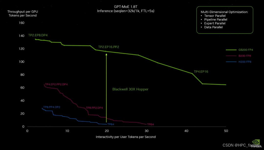 现在,用于大模型推理的速度是上代的 30 倍,黄仁勋展示了一张对比图,蓝线是 Hopper。