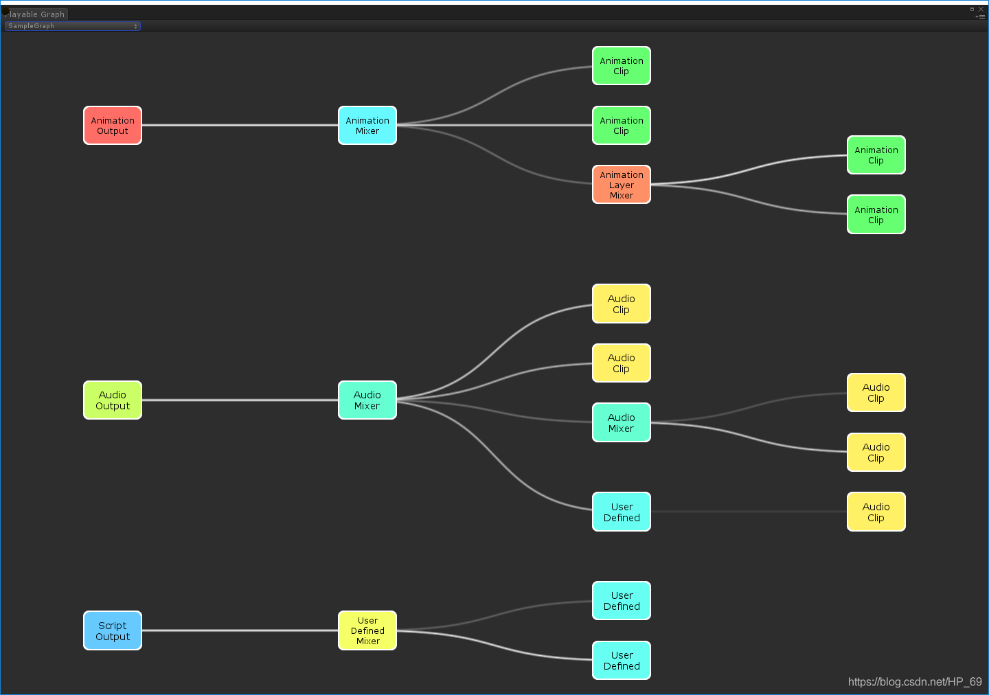 首先抛开TimeLine,学习一下图,就是PlayableGraph,图是一个整体。图里面有输出线,如上图。里面的内容分为两种:Output和Playable。新建个图,使用图创建Output,使用动画clip,声音clip,或者脚本 这些原始资源,创建Playable对象,最后将Output和Playable连接在一起,最后执行图的Play函数。
