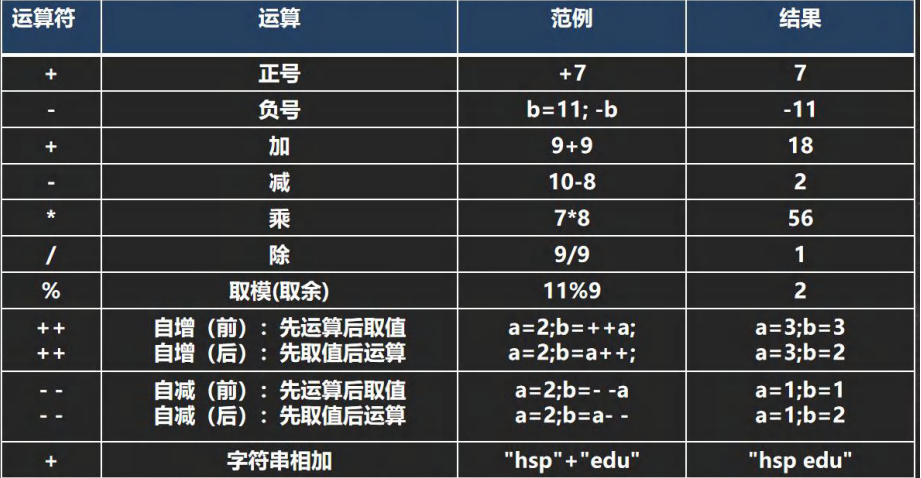 +加法-减法*乘法/除法%取模(求余数)++自增(前缀或后缀)--自减(前缀或后缀)
