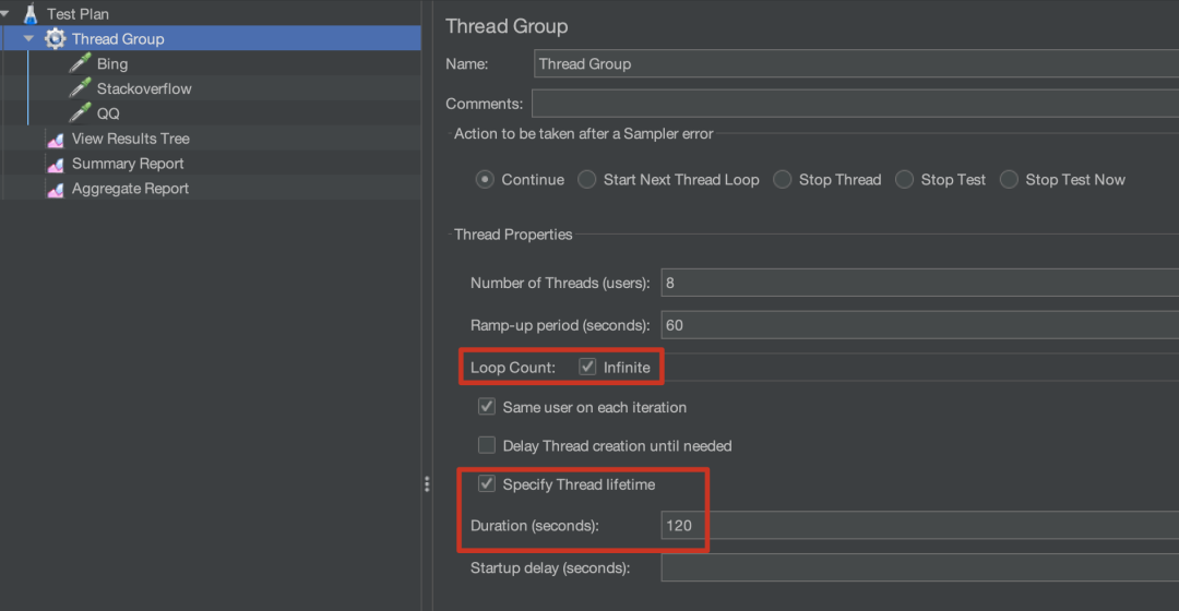 然后定义整个测试怎么跑,这里定义的是使用8个线程,60秒的热身和120秒的持续时长: