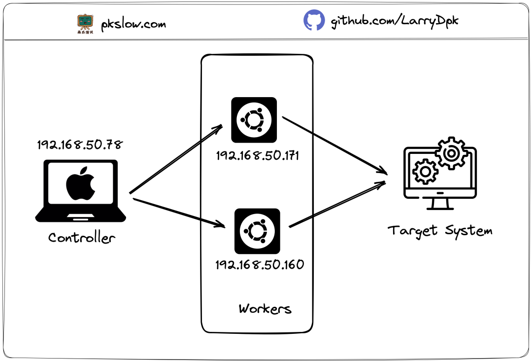在分布式测试角色中,我们需要一个控制节点Controller,还有多个工作节点Workers。如果你想你的请求增加,那可以通过不断增加工作节点来实现。Controller控制Workers,但它不跑具体的测试案例。Workers是连接目标系统来做具体测试的。