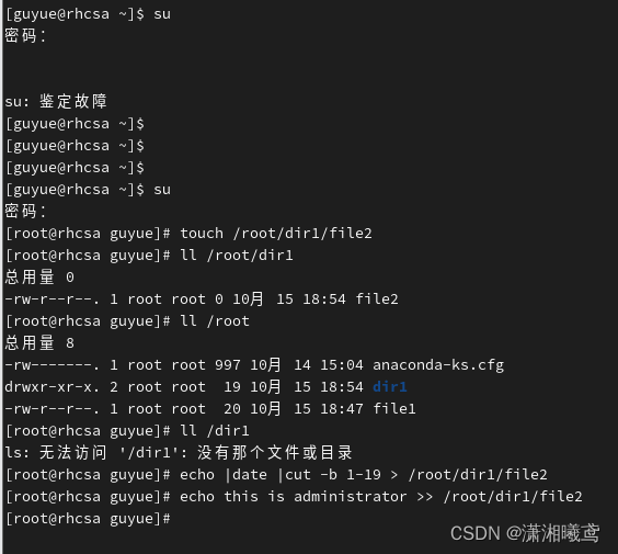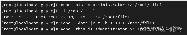 4、在/root/file1文件里面写入当前的时间并写入内容this is administrator