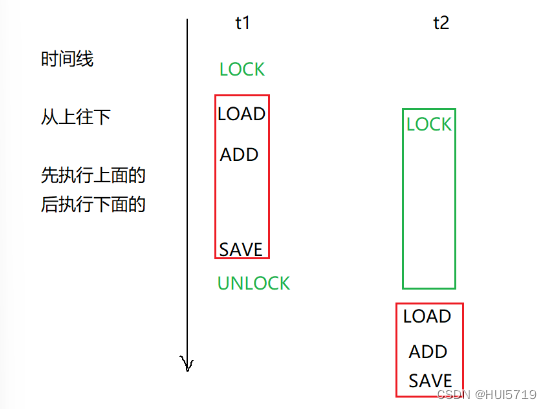 对于上面的t1和t2线程就是将LOAD、ADD、SAVE三个指令操作打包在一起,通过加锁的方式,把两个线程对数据的操作,变成了串行操作,让其非原子性变为原子性,就解决了线程不安全问题。 取数据之前,先加锁,在取数据操作,最后解锁出来。
