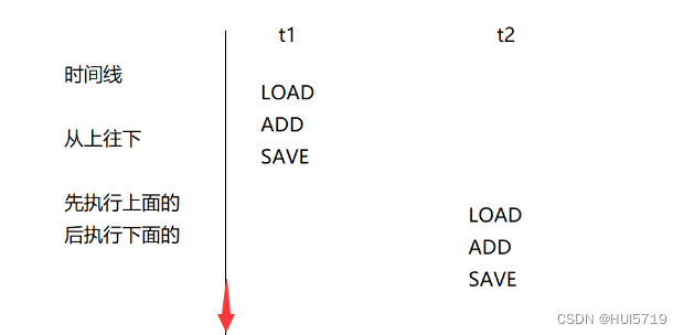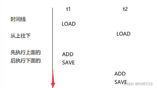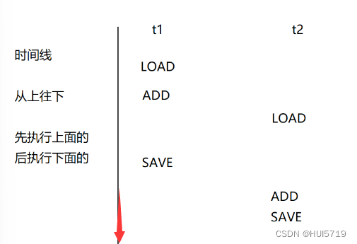 而线程的调度是随机的,可能会发生在任意时刻(LOAD | ADD | SAVE) 可能会在LOAD指令的前面,也可能会在ADD指令的前面,也可能会在SAVE指令的前面或者其后面。