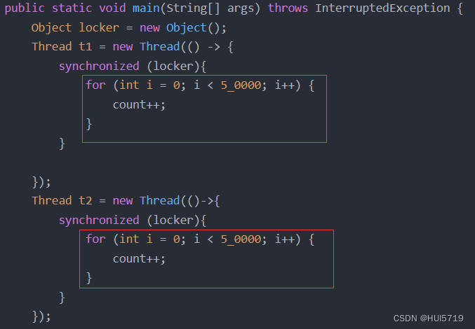 锁的对象可以是java的任何对象,通过synchronized,把for那块代码绑定在一起,变成了原子性。两个线程必须对同一个对象进行加锁,这两个线程才能构成竞争。