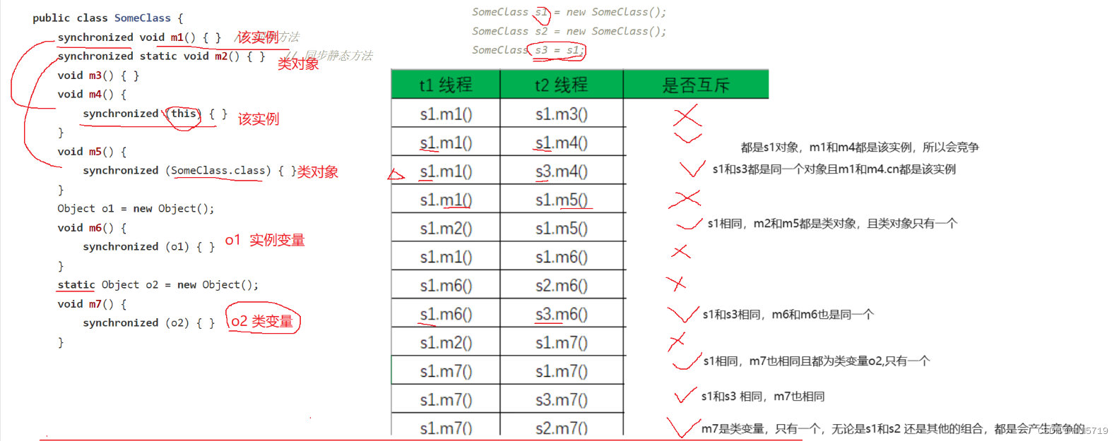 接下来让我们来看一下在不同的情况下,t1线程和t2线程是否会互斥(是否会争夺资源)。
