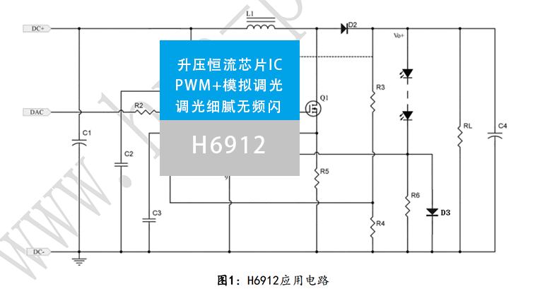 H6912是一款外围电路简洁的宽调光比升压调光LED恒流驱动器,可适用于2.6-40V输入