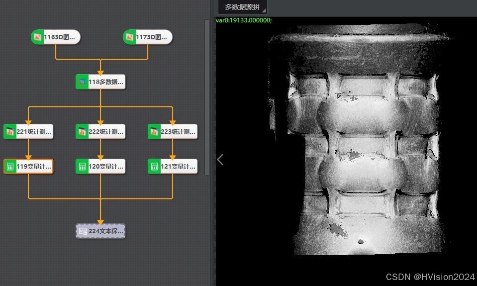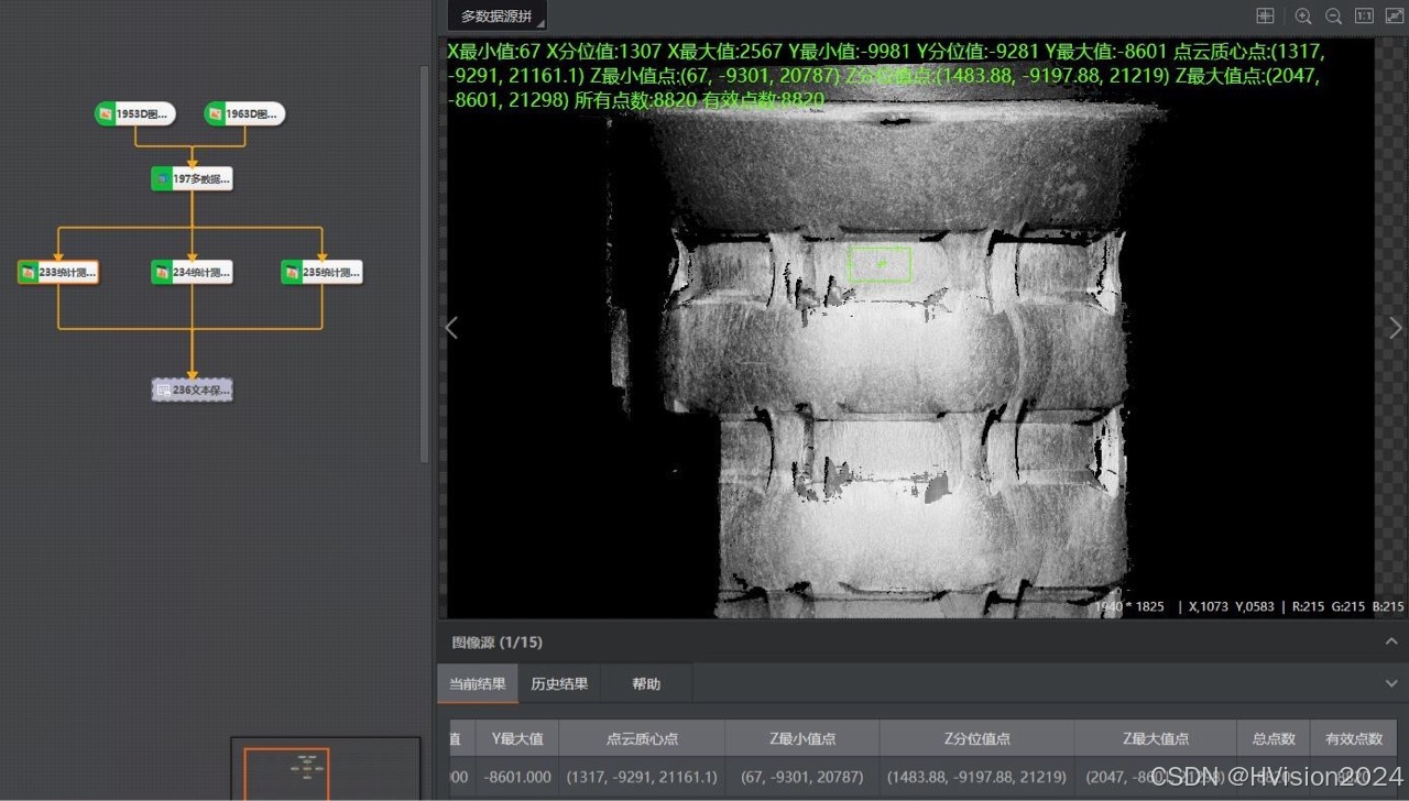 使用主副两个相机捕捉深度图像,然后将这些图像导入到VM 3D软件中。软件会将多个数据源的图像拼接成一个厚度图。通过统计测量区域内有效点的数据,可以得到该区域在Z方向上的最大值。