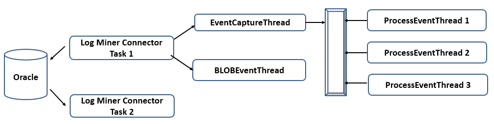 除了支持多个任务并行化之外,MRS CDL还支持任务内的并行化。它在任务中使用日志复制按顺序从RDBMS捕获CDC事件。但是,一旦我们捕获CDC事件,我们就会将其推送到内部内存队列,并使用执行器线程池并行处理,如下所示。这些线程将从内部队列中提取事件,处理它并推送到Kafka,从而提高性能。