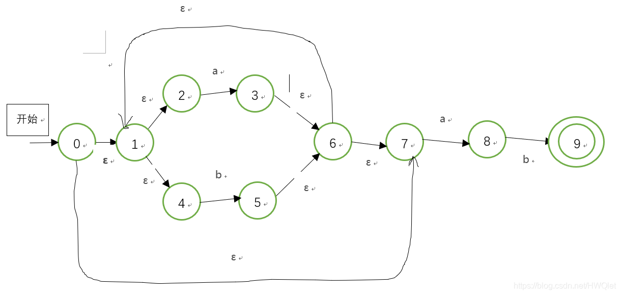 接着求出状态A经过除了ε条件的其他条件转换得到的状态集,这叫后继状态,后继状态不包括自身