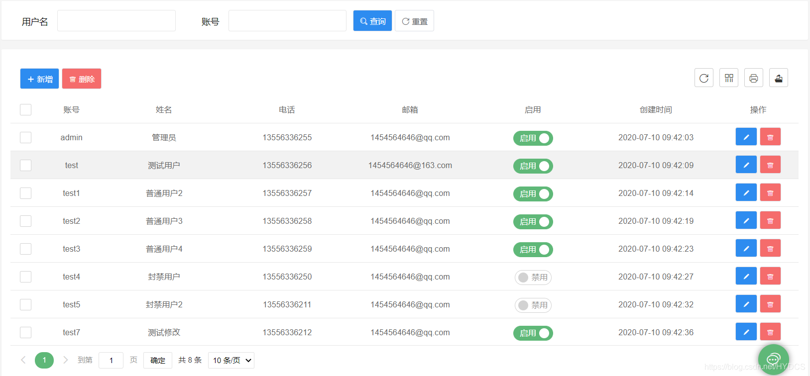 这里无非也就是一些增删改查,要写的完善点的话也就是新增用户时手机号是否能相同等等。我这里新增用户时,会给他一个默认的密码123456