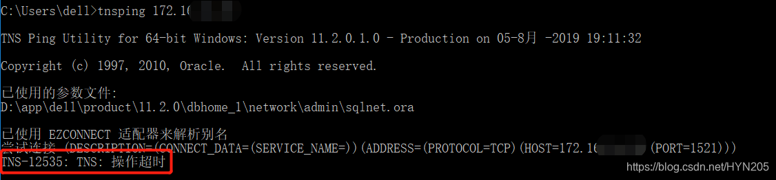 2、使用tnsping命令检查,报TNS-12535: TNS: 操作超时,这时我们可以肯定是防火墙的问题了