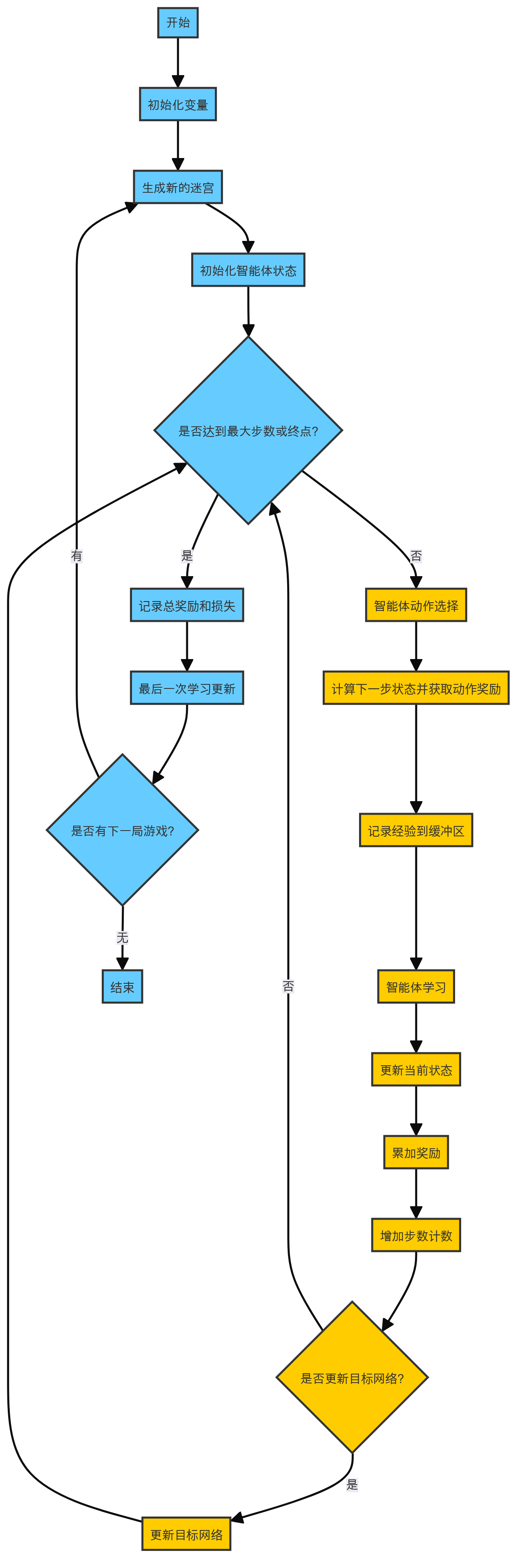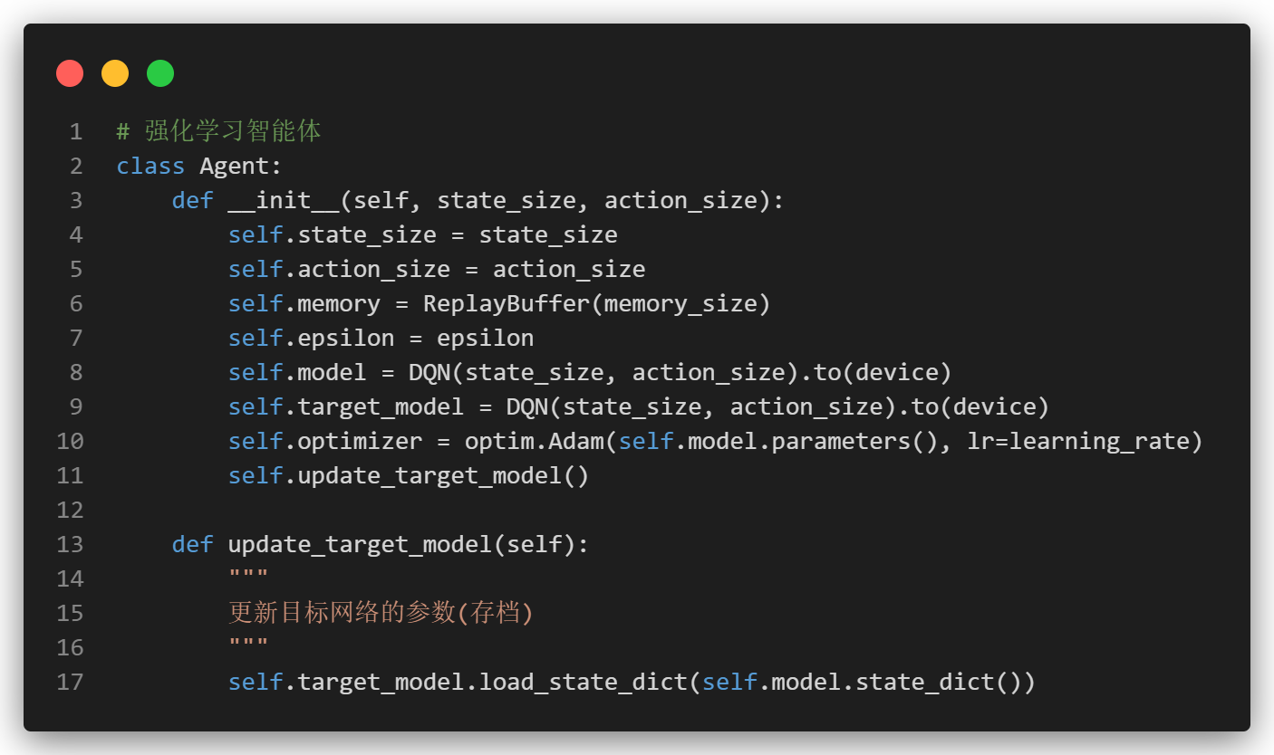- 智能体根据当前Q网络选择动作,存储经验到回放缓存(Replay Buffer),从回放缓存中抽样进行训练,使用目标网络计算目标Q值,更新Q网络的参数。