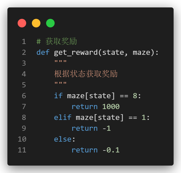 我们的奖励逻辑和之前相同,从直观看,我们到达终点之后就给予大量奖励,每走1步扣0.1分。撞到墙上了就扣1分。