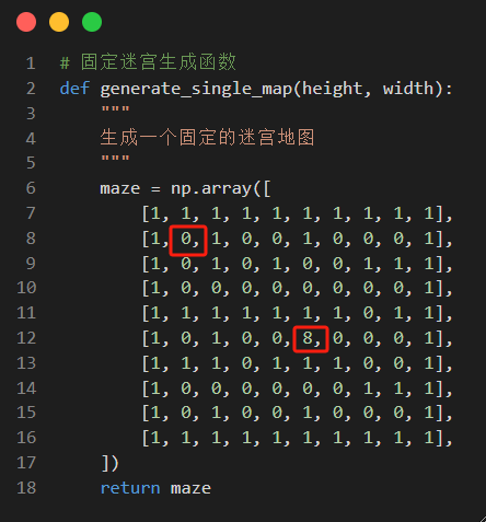 我们首先写一个固定地图生成函数,设置终点为数值8,1为墙,0为路。坐标(1,1)的0是我们固定的出发点。