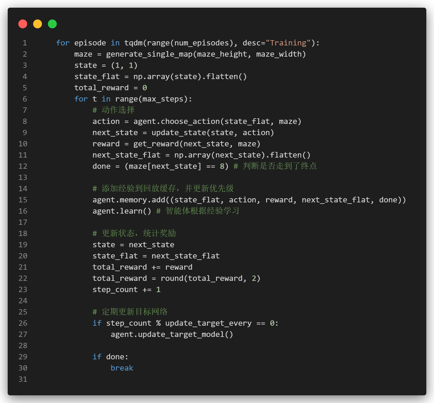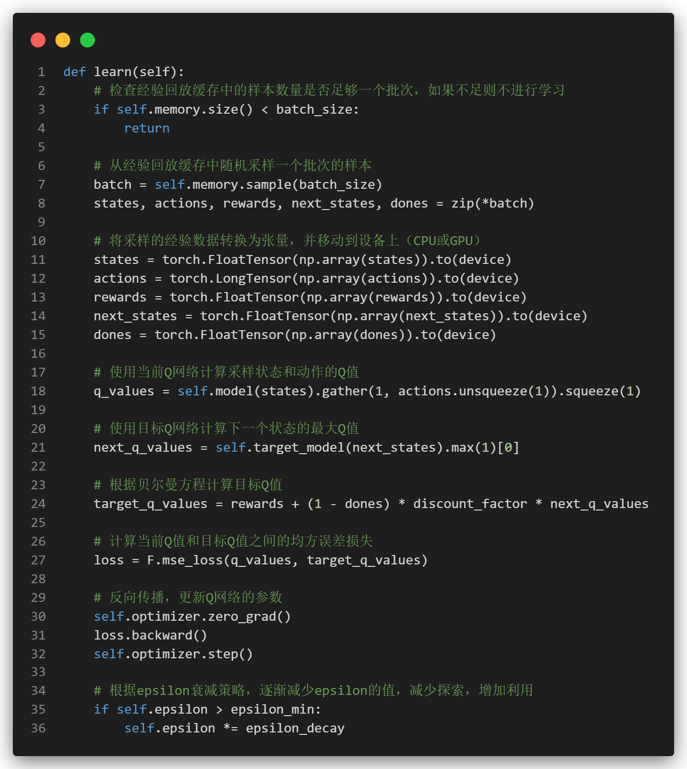 我们首先从经验回放缓冲区中随机采样,转为张量后,计算当前Q值和下一状态Q值,根据贝尔曼方程计算目标Q值,目标Q值等于当前奖励加上折扣因子乘以下一个状态的最大Q值。
