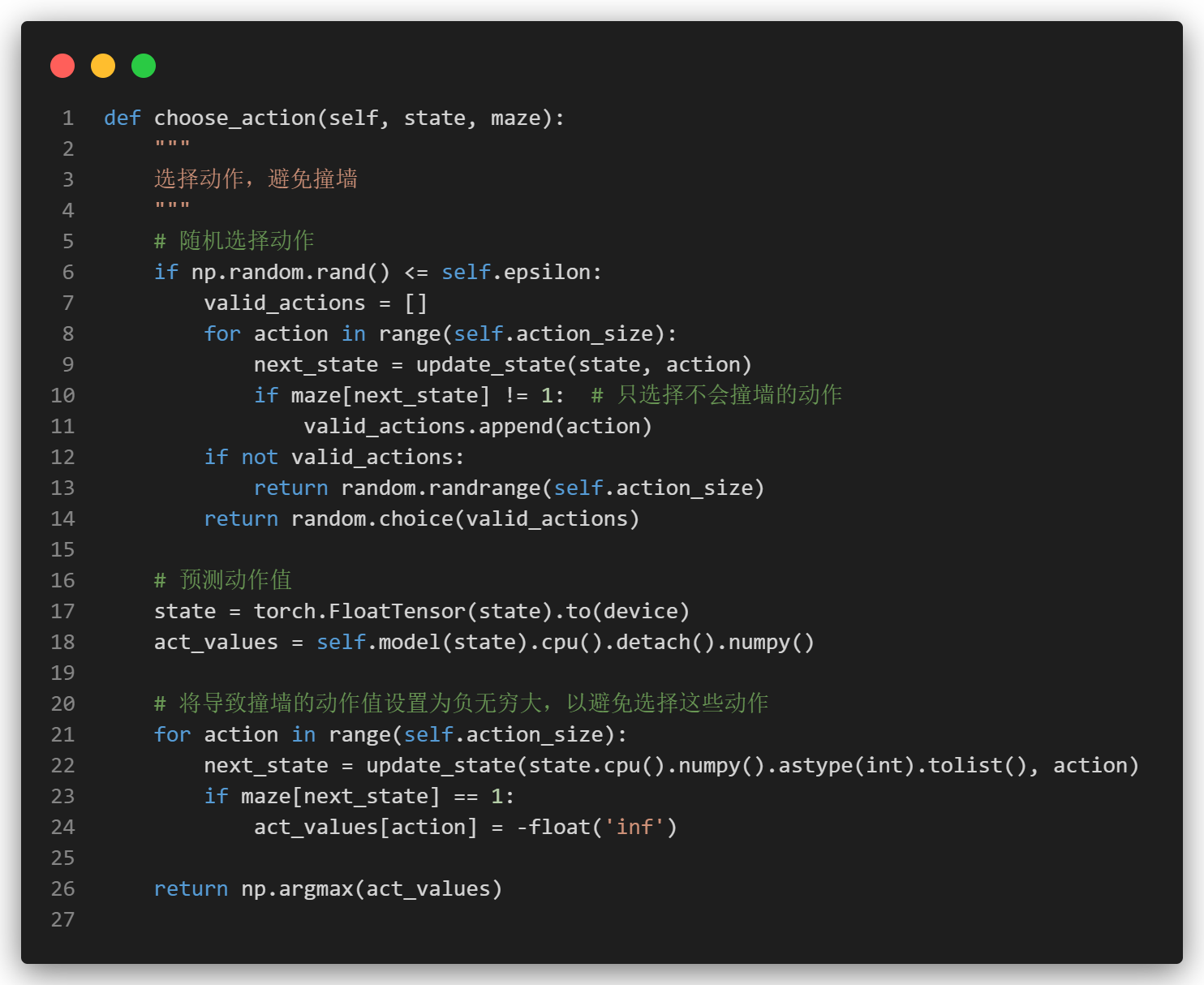 (不过我们在下面的动作选择进行了合法动作的过滤,理论上是不会撞墙的。)