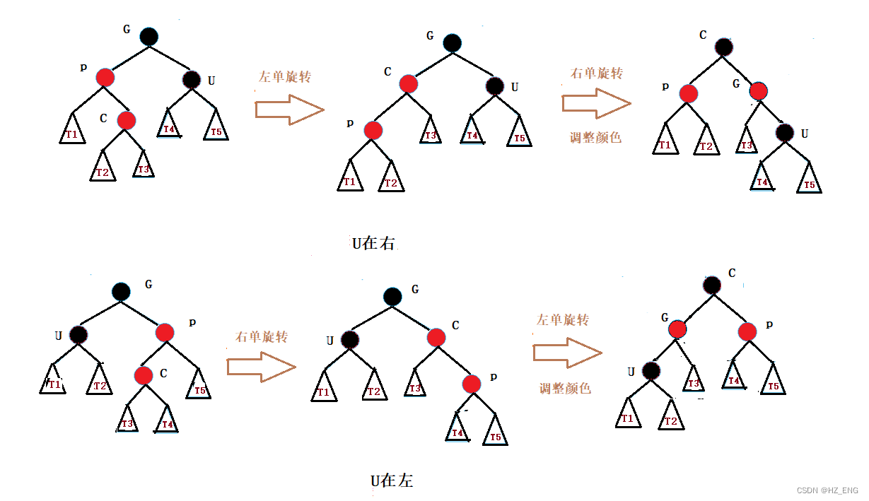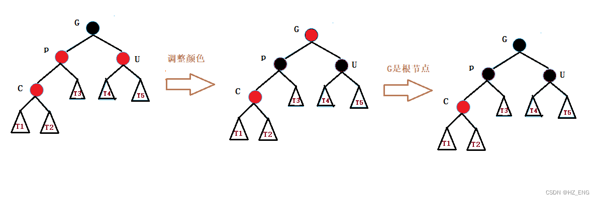 新插入节点(C)的父节点(P)是红色,但新插入结点的叔叔节点(U)是黑色或空节点: