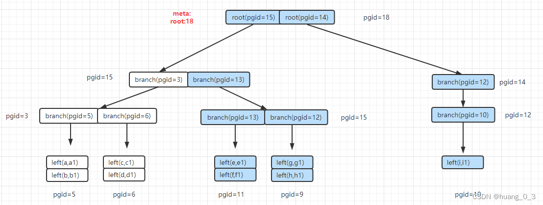 pageid=2 流程相似,一直分裂,直到根节点。并更新 root=18。并将脏数据和元数据写入文件中。