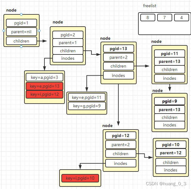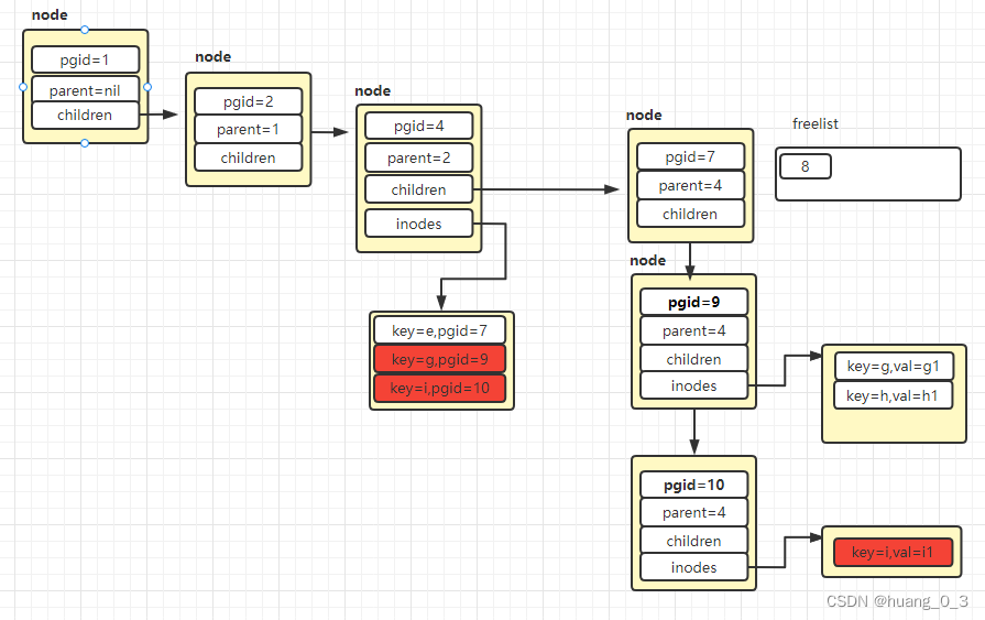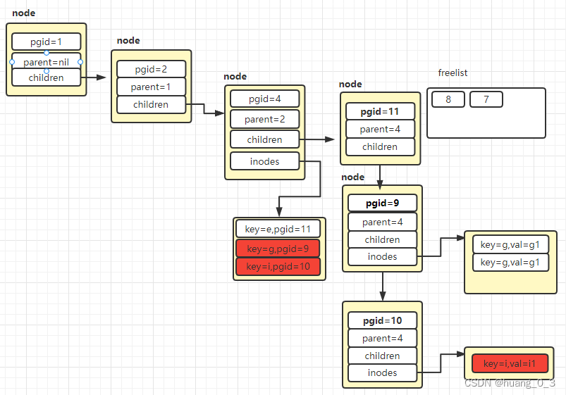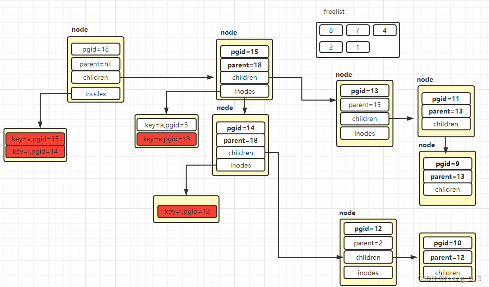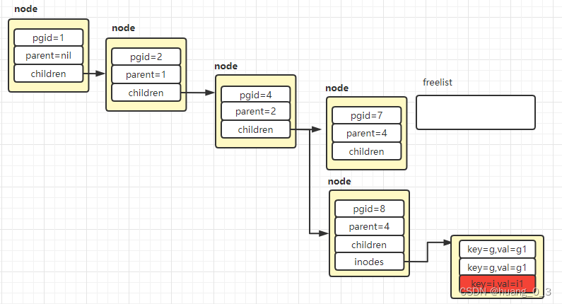 查找过程,将遍历的 page 转换为 node 结构(读取到内存中),并插入 key=i、value=i1。freelist 表示空闲列表。