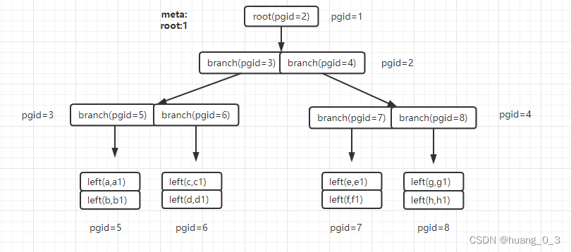 下面将演示一下分裂过程,为了方便演示,假设每页最大存储两个元素,除叶子节点外,其他都是分支节点。branch(分支节点)内部pgid指向下一个要读取的pgid,直到读取到left(叶子节点)。初始状态根节点root=1。