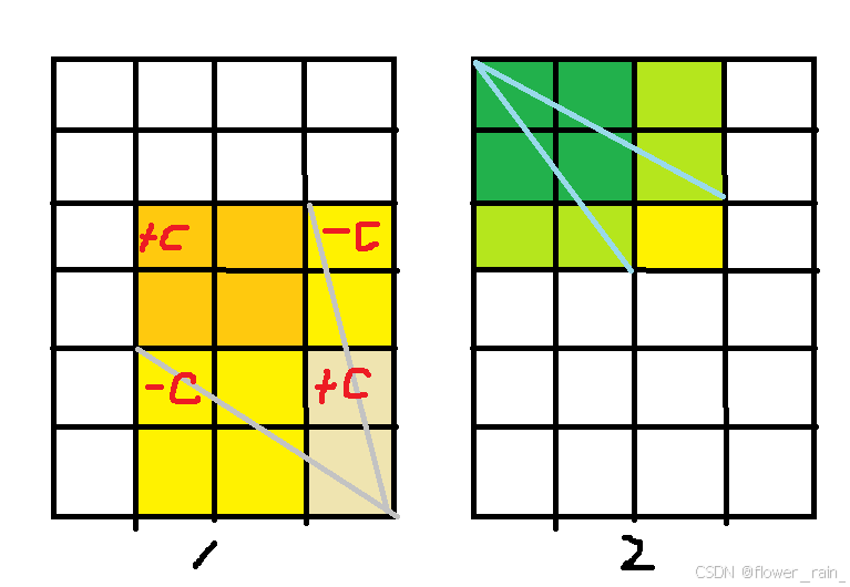 我们看到上图第三个矩形,如果在所示位置加 c ,那么最后在求 b 数组的前缀和的时候,会让打对号的位置都加上 c ( 因为它们和左上角的连线的矩形中都会包含 +c 的那个数,可以先回忆一下二维前缀和怎么求,基本公式是s [ i ] [ j ] = s [ i - 1] [ j ] + s[ i ] [ j - 1] - s [ i - 1] [ j - 1] + a [ i ] [ j ] ) 理解了这个性质我们就可以很好地降低时间复杂度了。