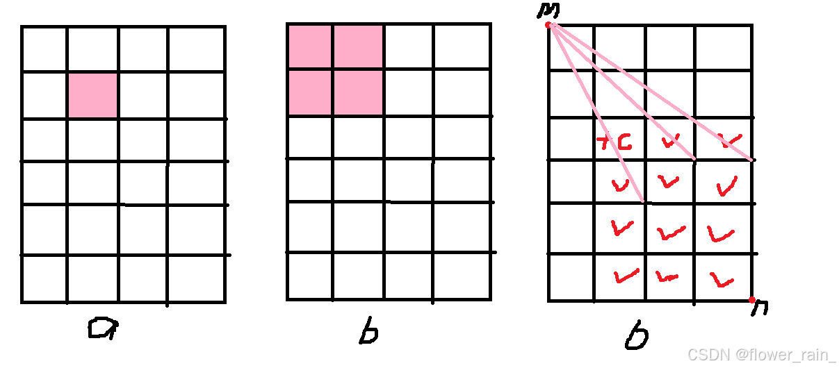 我们把给定数组看为前缀和数组,类比二维前缀和的做法,构造一个差分数组b,使得 a [ i ] [ j ] 是 b [ i ] [ j ] 到左上角连线的矩阵中的所有数之和。如图上粉色方块所示。