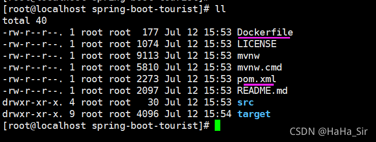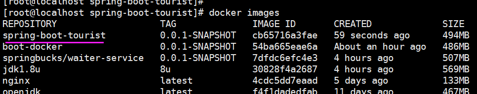 spring-boot-tourist:0.0.1-SNAPSHOT : 镜像名称:标签名 ; docker images 查看