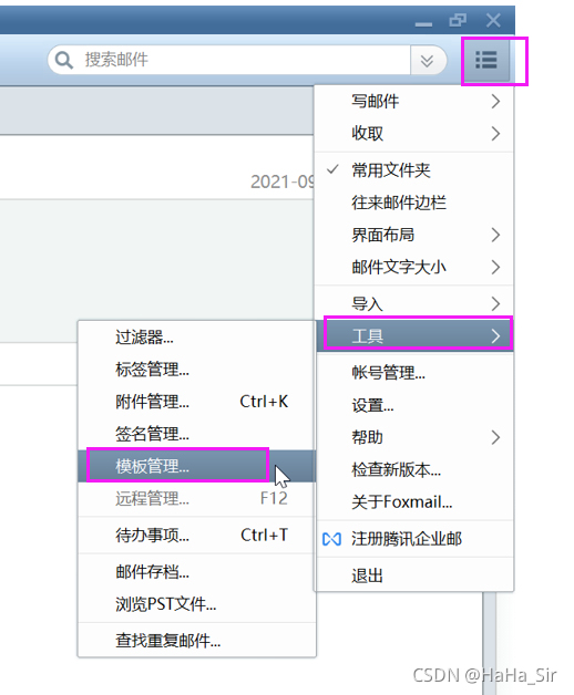 在使用Foxmail设置签名时遇到默认横线,可以按照以下步骤操作:打开右上角工具,进入模板管理,选择HTML邮件,在发信人签名位置删除默认横线。此方法适用于Foxmail 7.2.20.273版本。
