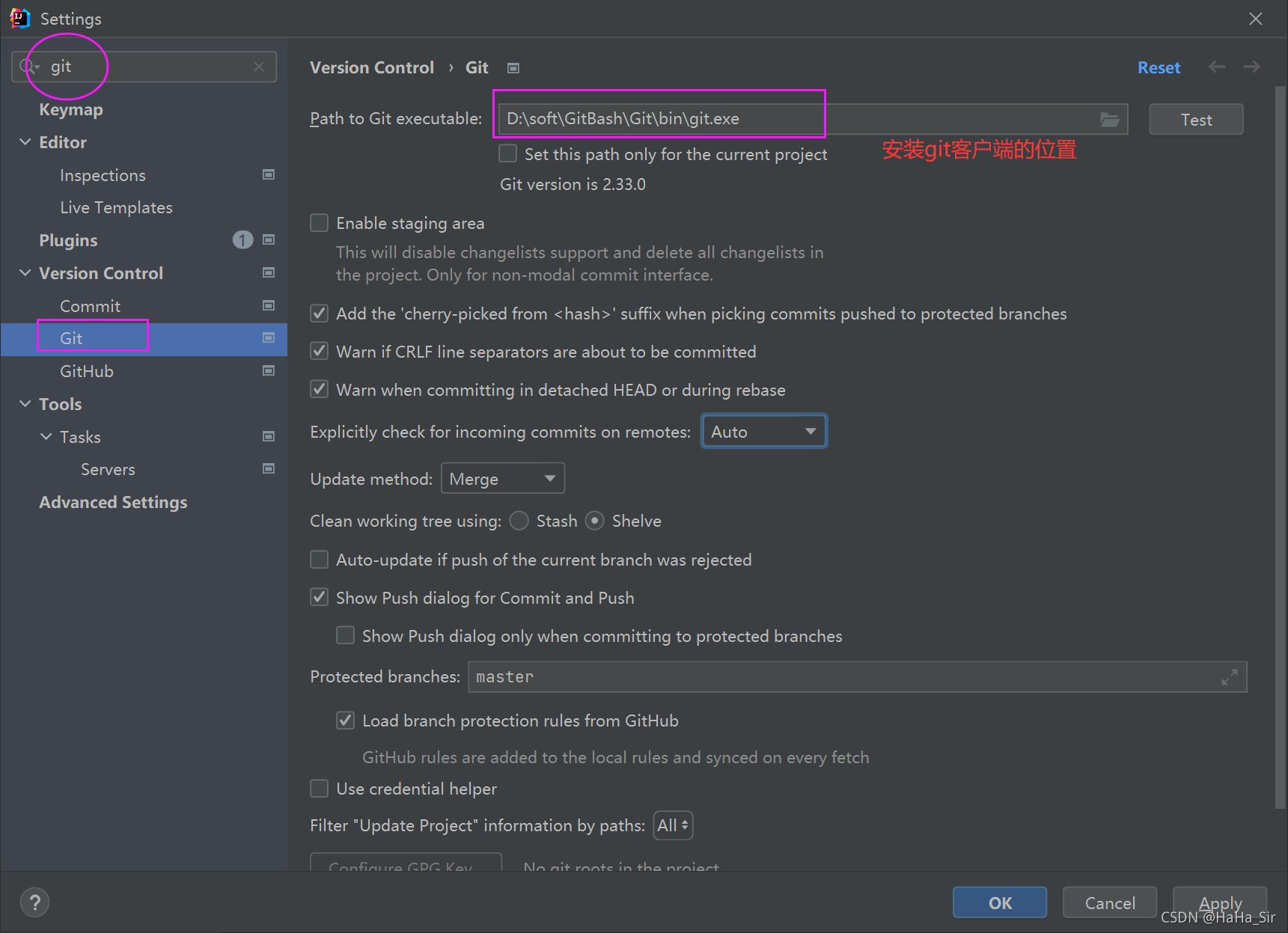 1、打开Idea --- File --- Settings --- 搜索"Git" --- 选择步骤一 中安装的Gitbash的位置。