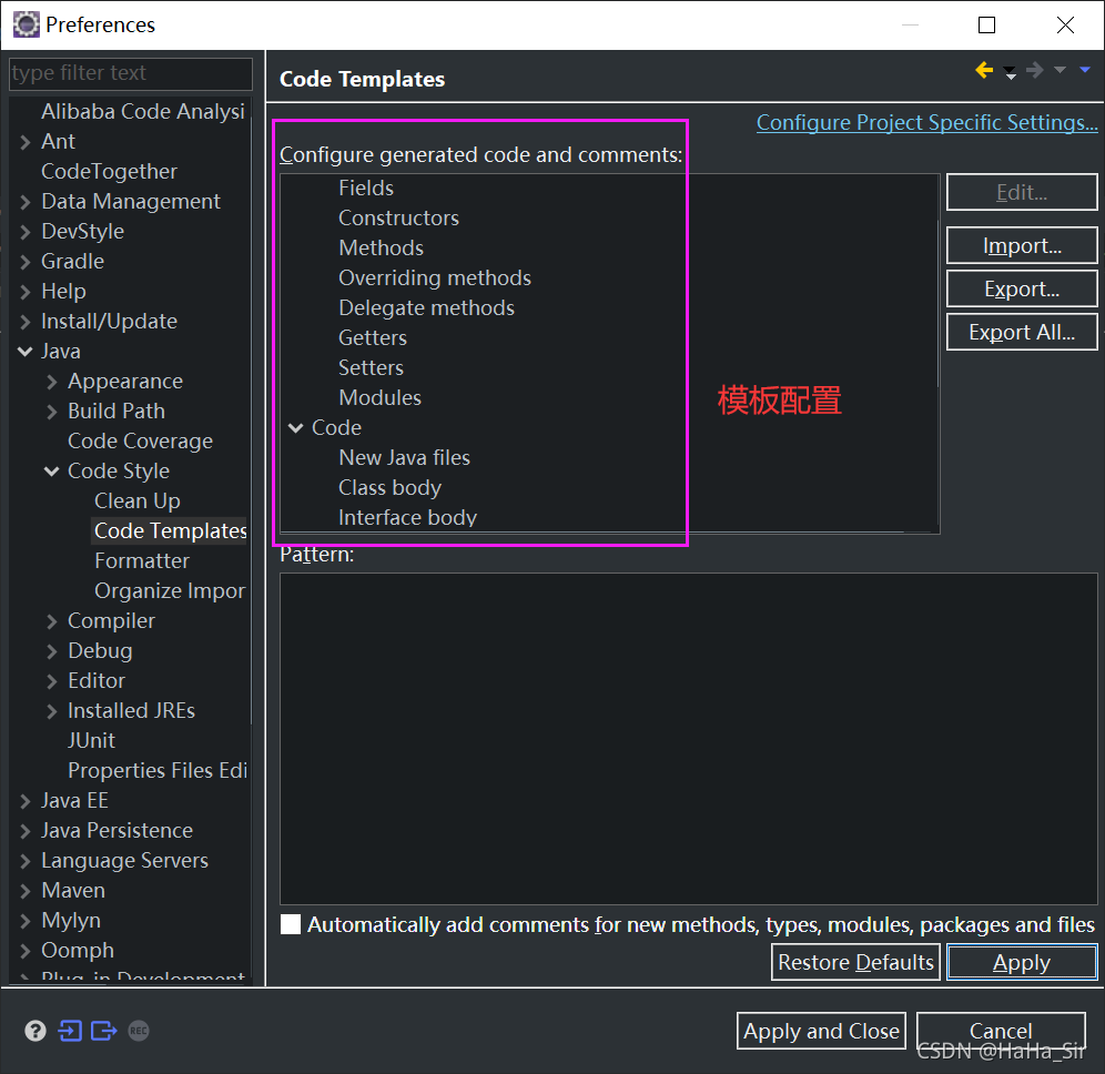 1、Eclipse中 --> Window–>Preferences–>Java–>Code Style–> Code Templates