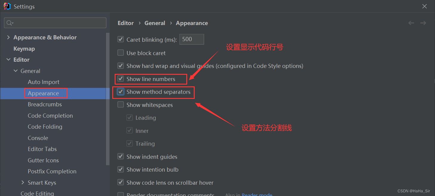 1、显示代码行号,步骤是: File --- Settings --- Editor --- General --- Appearance --- 勾选 " Show line numbers " 。