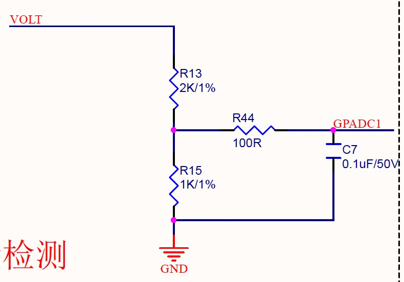 1、电压检测使用的是MCU的GADC1通道。