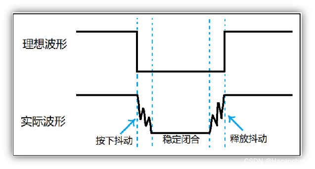 按键抖动:由于按键内部使用的是机械式弹簧片来进行通断的,所以在按下和松手的瞬间会伴随有一连串的抖动。