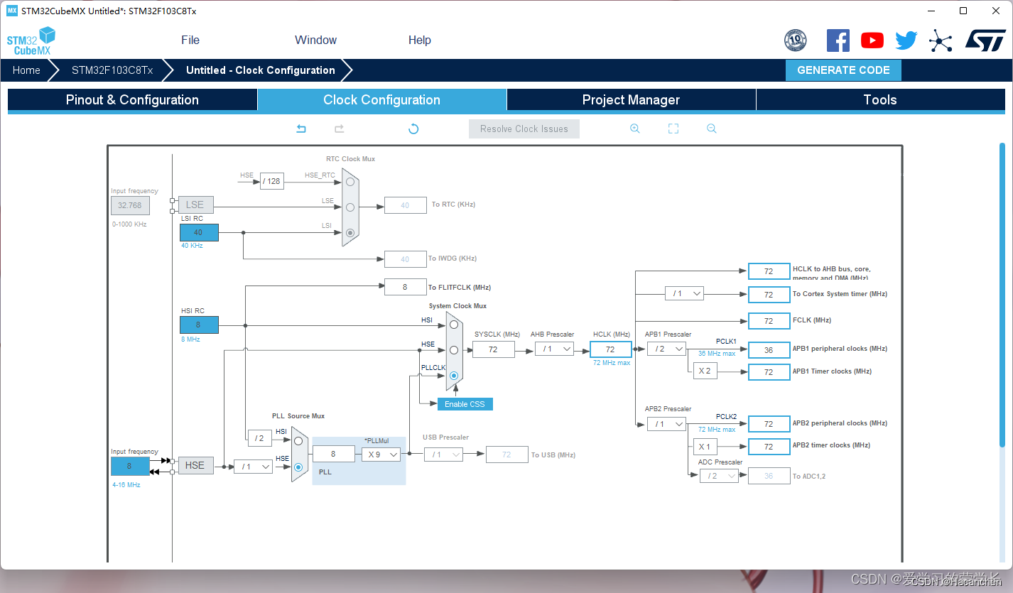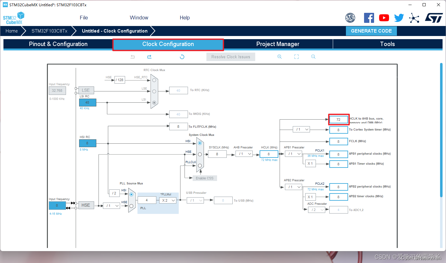 9.单击Clock Configuration在这里输入72,按下回车 → OK,自动配置时钟频率为72Mhz