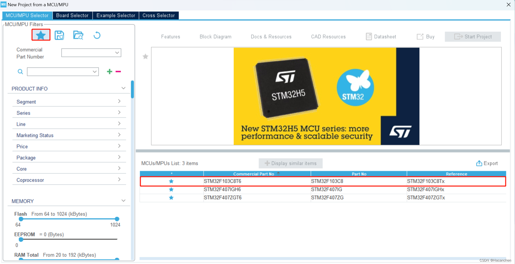 2.CubeMX自动下完补丁包之后,会弹出芯片选择界面,在Commercial搜索框输入F103C8T6右下方会自动出现STM32F103C8T6,双击芯片。